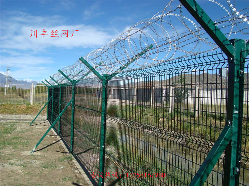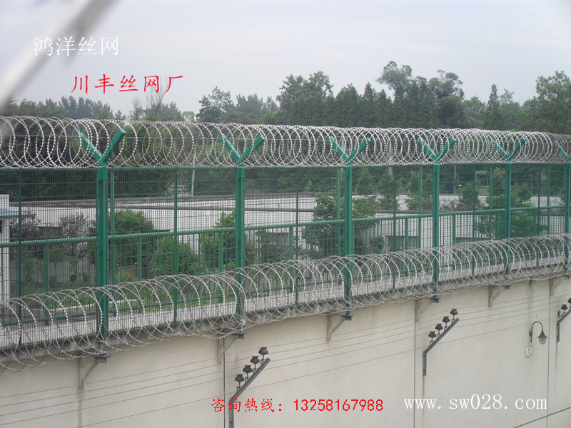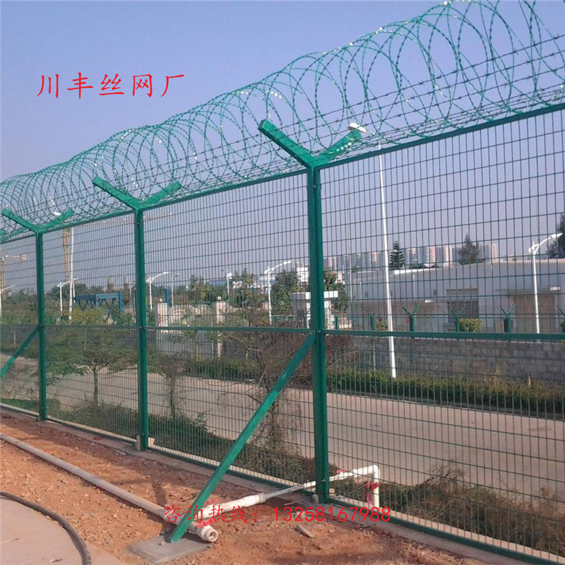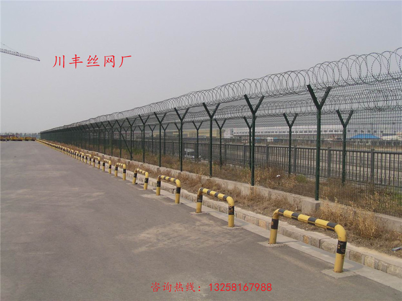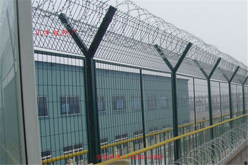 機(jī)場、監(jiān)獄護(hù)欄網(wǎng)又稱作“Y型安全防御護(hù)網(wǎng)”,是由V型支架立柱,加強(qiáng)型焊接片網(wǎng),安全防盜連接件和不銹鋼刀片刺網(wǎng)組成強(qiáng)度和安全防御性級別很高。