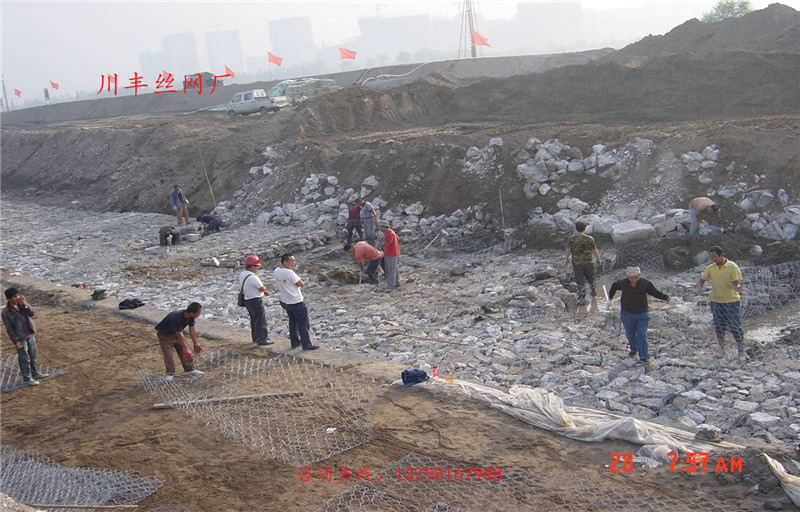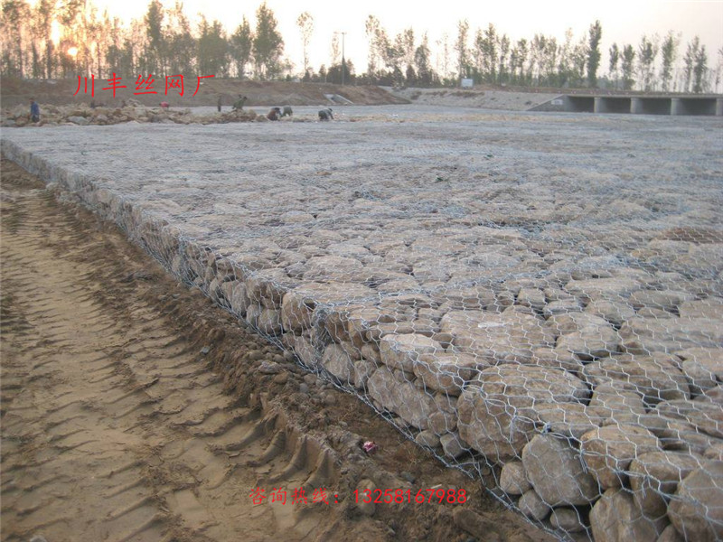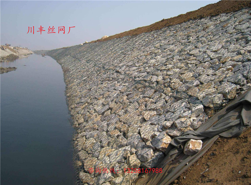 雷諾護(hù)墊是厚度在0.17-0.5m的網(wǎng)箱結(jié)構(gòu),在現(xiàn)場用于裝填石頭。主要用作河道、岸坡、路基邊坡護(hù)坡結(jié)構(gòu)。既可防止河岸遭水流、風(fēng)浪侵襲而破壞,又實(shí)現(xiàn)了水體與坡下土體間的自然對(duì)流交換功能,達(dá)到生態(tài)平衡。坡上植綠可增添景觀、綠化效果。